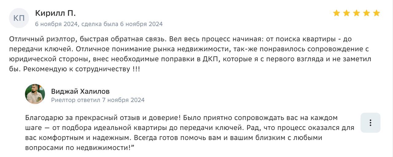 Виджай ХалиловРиелтор ответил 28 октября 2025Спасибо за доверие! Рад, что всё прошло успешно. Пусть новая квартира приносит только радость!