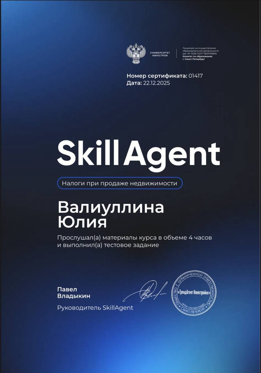 Хочу поблагодарить Юлию Валиуллину за отличную работу. Всё сделала грамотно и, что важно, быстро. Мы поначалу переживали, как всё пройдёт, но в итоге сделка проскочила легко и без лишней суеты. Юлия Альбертовна всегда была на связи, на вопросы отвечала чётко и по делу, без лишней воды. Сразу видно — человек на своём месте и знает, что делает. Специалист надежный, рекомендую.