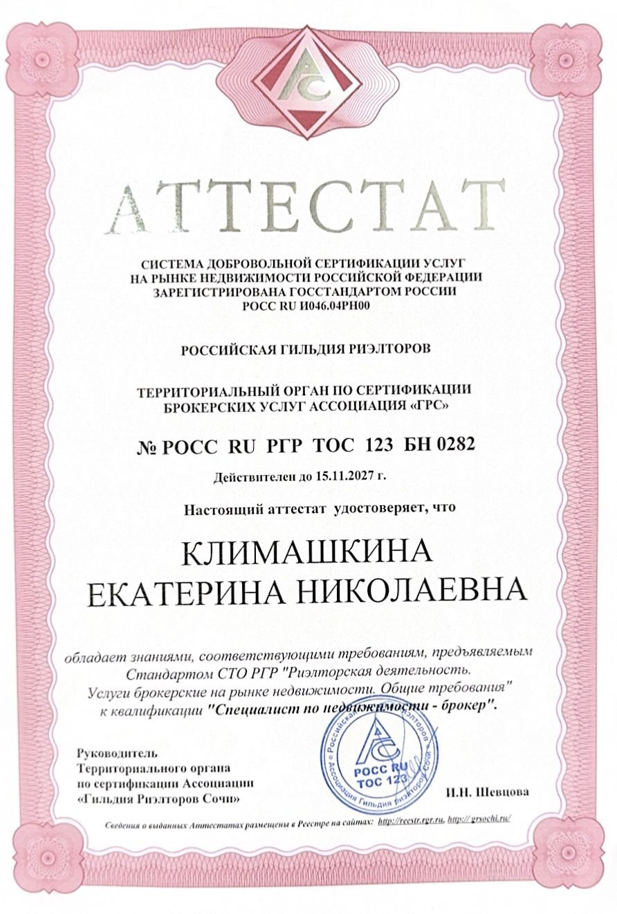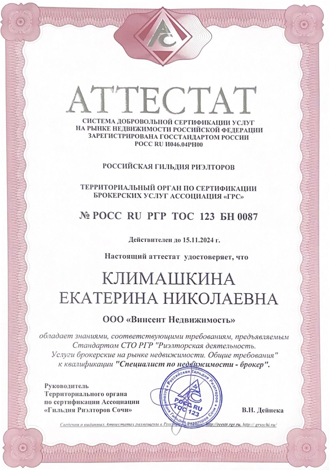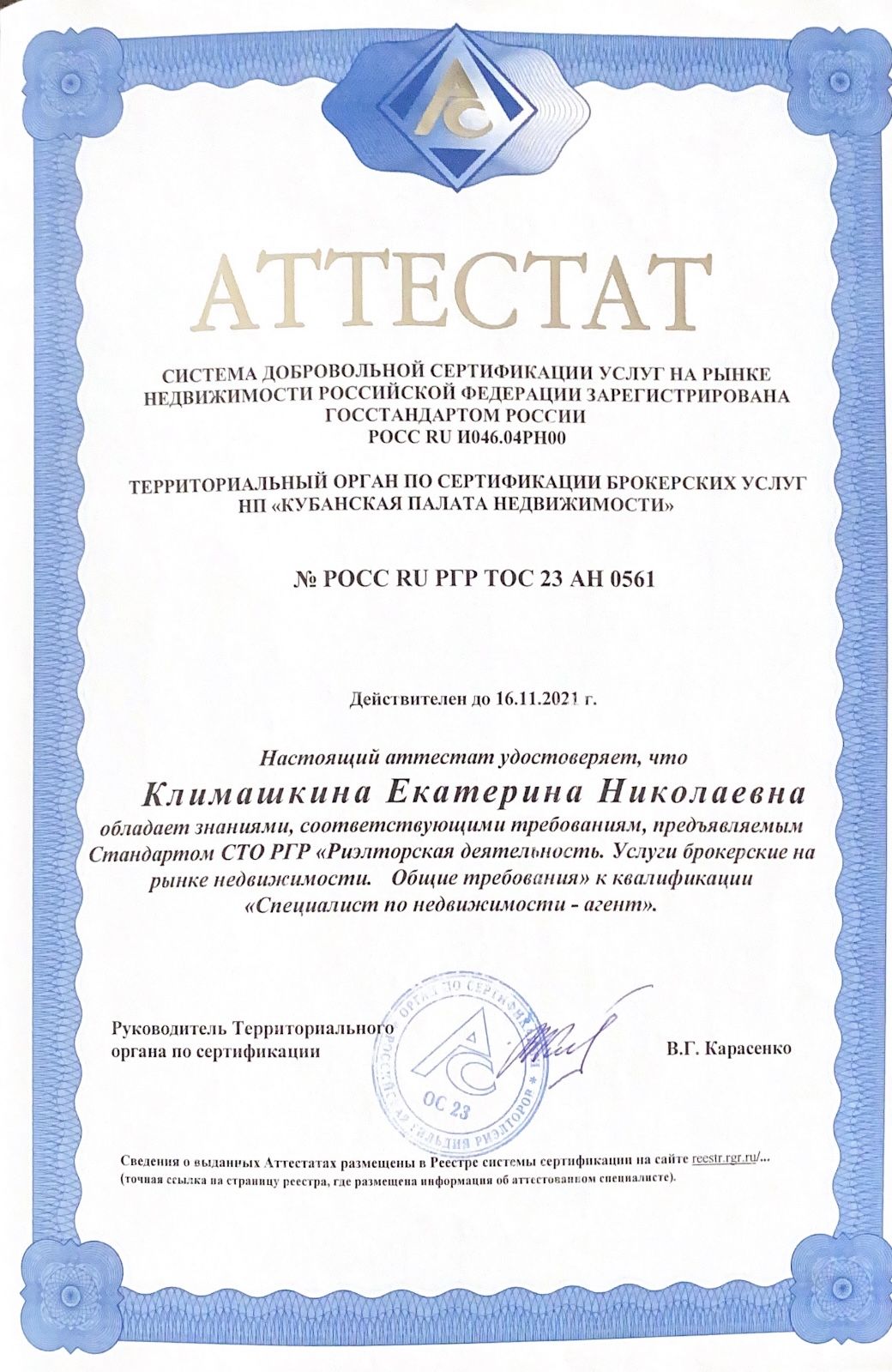 Екатерина Климашкина безупречный, грамотный и высоко профессиональный риелтор! Восхищаюсь ее личными качествами: интеллигентностью, вежливостью, организованностью! Екатерина отвечает на все вопросы оперативно и полно, сопровождает сделку с самого зарождения желания купить и доводит до конца регистрации права собственности на приобретенную недвижимость! Очень приятно общаться с таким высоким...