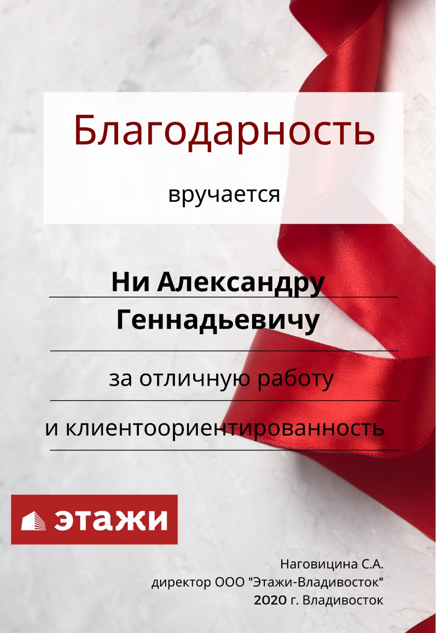 Я очень довольна проделанной работой, агентством "Этажи", в частности Александром Ни. Изначально обратились по вопросу продажи квартиры, Александр проявил себя в работе как и подобает профессионалу, была проведена аналитика стоимости квартиры, были предоставлены рекомендации по стоимости с учетом спроса. Ко всем сторонам сделки относился искренне и по справедливости (многие риэлторы обычно встают...
