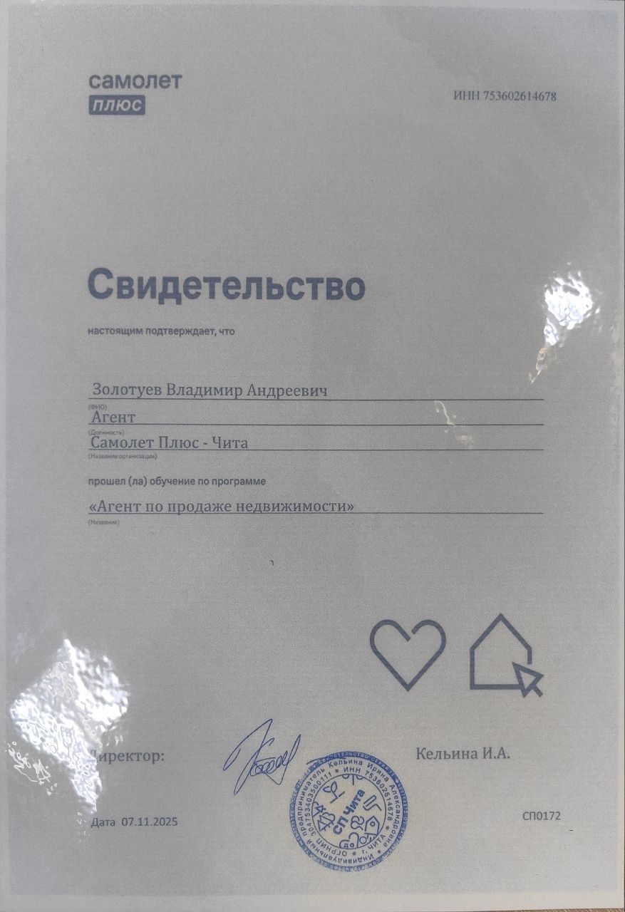 Хотим выразить большую благодарность агенту Золотуеву Владимиру за оперативность, тактичность, внимательность. Владимир помог быстро найти нужную квартиру в желаемом ЖК, вместе со своей командой оформить все необходимые документы и провести сделку. Работа на 5+! Очень довольны, что обратились в Самолет плюс. Желаем побольше благодарных клиентов и новых сделок!