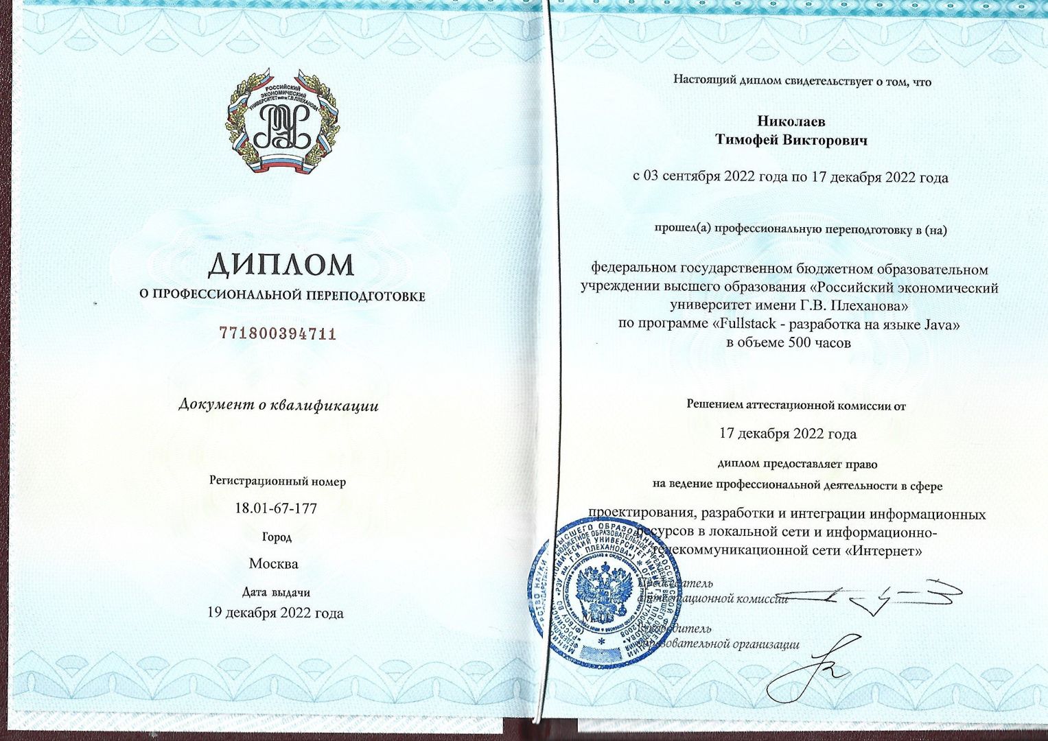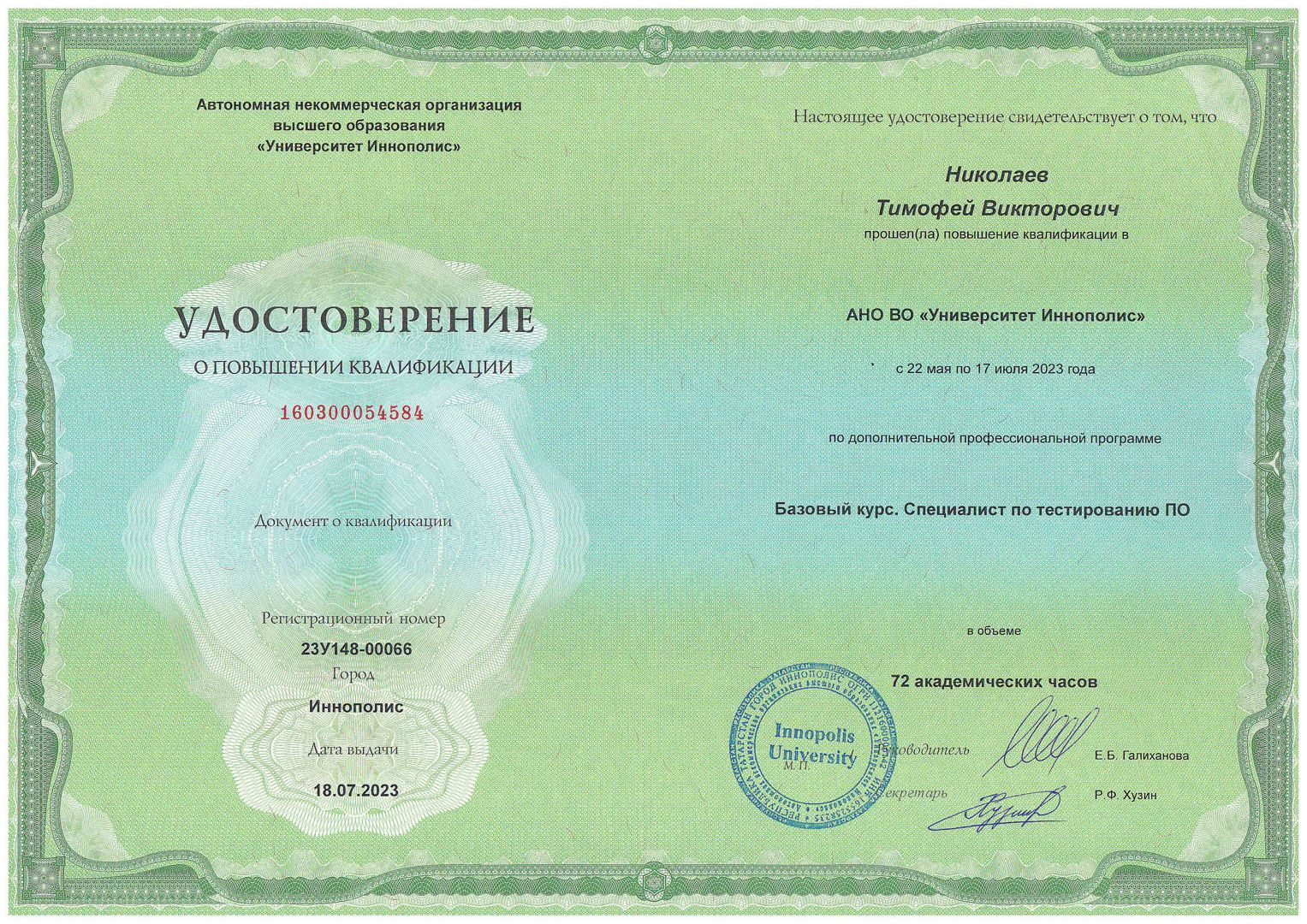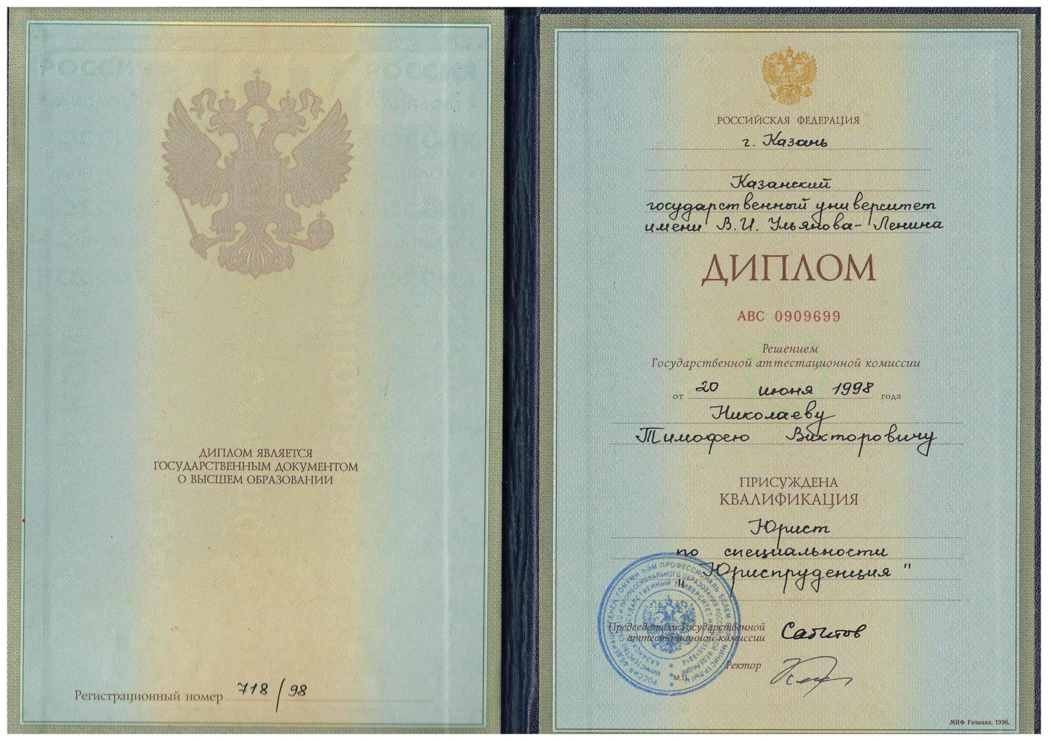По первому высшему образованию окончил Юридический факультет «Казанского государственного университета» имени В. И. Ульянова-Ленина в 1998 году. В 2022 году окончил «Российский экономический университет им. Г.В. Плеханова», по программе «Fullstack - разработка на языке Java» с предоставлением права ведения Профессиональной деятельности в сфере проектирования, разработки и интеграции...