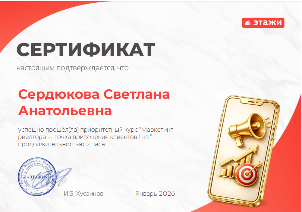 Сегодня мою сделку сопровождала риелтор Светлана Сердюкова, безупречно грамотная, быстрая, специалист в своем деле, я ей полностью доверяла, всё состоялось на высшем уровне, я благодарна компании Этажи, всем буду рекомендовать, а главное лучшего Риелтора, Светлану Сердюкову ❤️