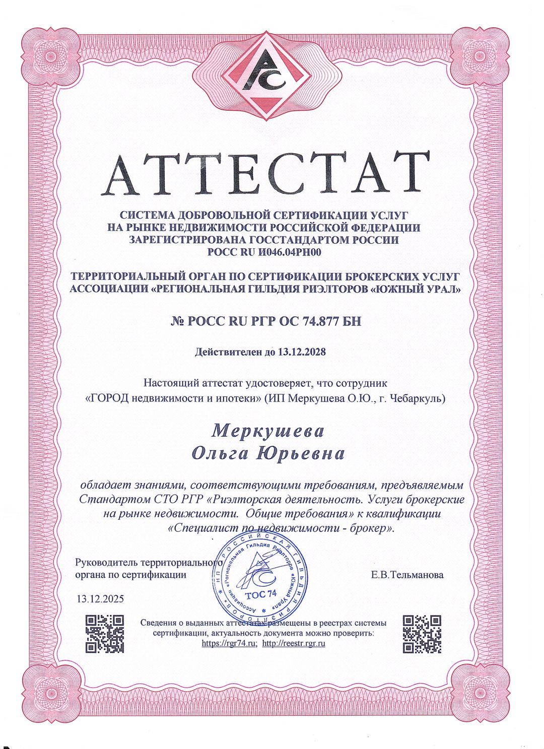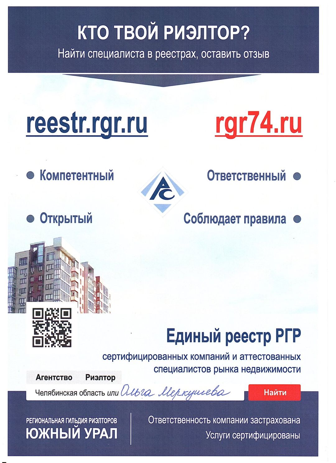 Ольга Меркушева, аттестованный брокер по недвижимости с 14-летним опытом работы на рынке недвижимости г. Чебаркуля и Челябинской области. Информация обо мне размещена в открытом реестре: ✅Реестр Региональной Гильдии Риэлторов "Южный Урал" ✅Реестр Российской Гильдии Риэлторов Профессиональная ответственность застрахована в СПАО «Ингосстрах».