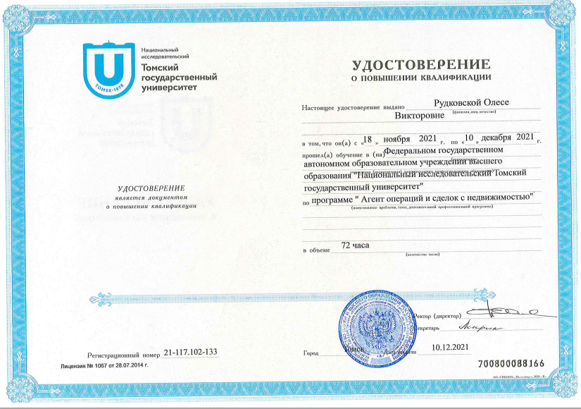 Добрый день, хочу поблагодарить профессионального специалиста в ипотечном кредитовании Олесю Викторовну Рудковскую,проводили сделку по покупке дома в Иркутске,все моменты учтены,расходы минимизированы,все под контролем ,даже запятые в договоре, Уважаемые клиенты в сфере недвижимости, если Вам нужна полная прозрачность сделки,то вам к Олеси Викторовне.