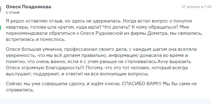 Выражаю огромную благодарность Рудковской Олеси за оперативность и профессионализм. Качественное и грамотное ведение сделки от начала до конца. Благодаря её компетентности и поддержке сделка прошла гладко.Видно,что человек работает на результат, на очень хороший результат. 👍