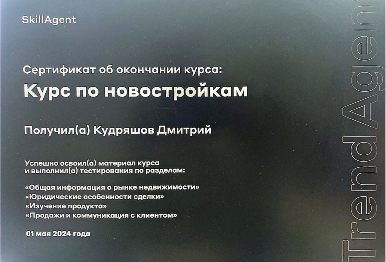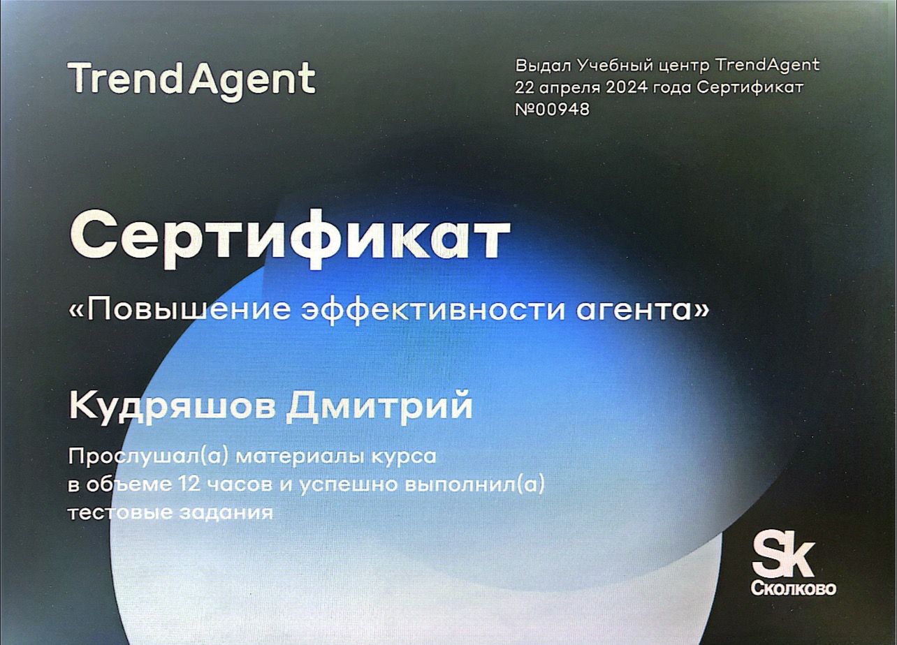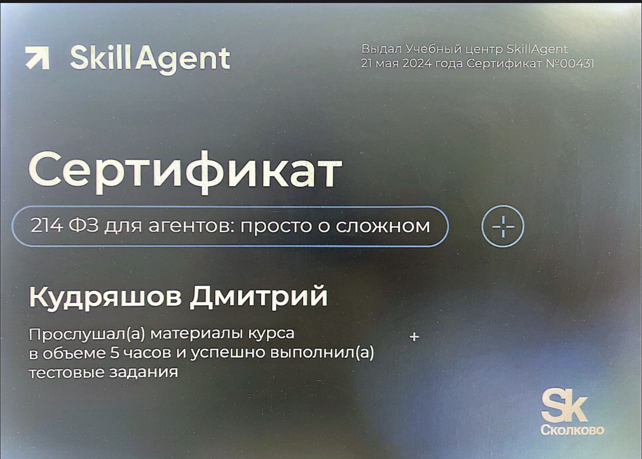 Я, Дмитрий Кудряшов, эксперт по недвижимости с 8 летним опытом. За это время я помог более 260 клиентам успешно продать или купить недвижимость. Купить или продать недвижимость важный шаг в жизни любого человека! Сделайте этот шаг с профессионалом! С уважением, Дмитрий Кудряшов Эксперт по продаже недвижимости. Звоните! Пишите! Всегда рад помочь!