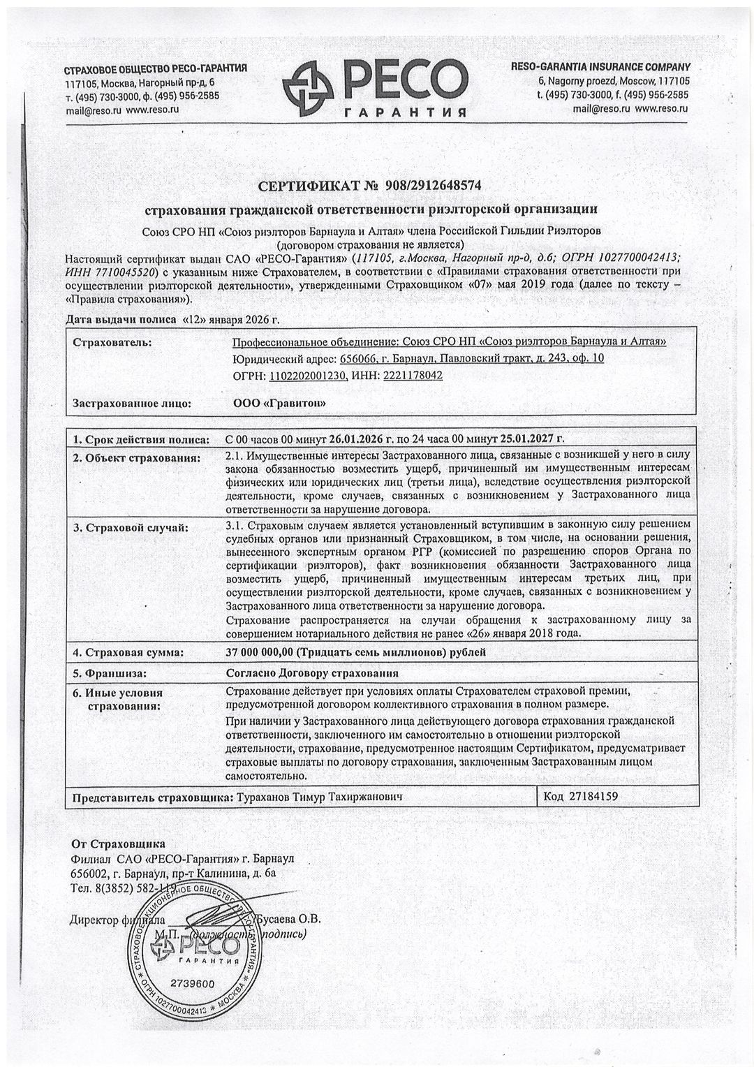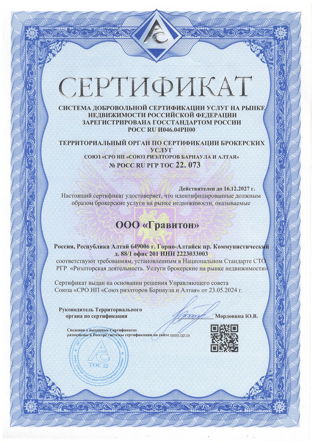 Агентство недвижимости «Гравитон» основано в 2000 году. Профессиональная деятельность сертифицирована и застрахована. Генеральный директор компании Ирина Игоревна Снитко. Компания Гравитон внесена в Единый реестр сертифицированных компаний и аттестованных специалистов рынка недвижимости РФ и является действительным членом Российской Гильдии Риэлторов и Союза Риэлторов Барнаула и Алтая. За...