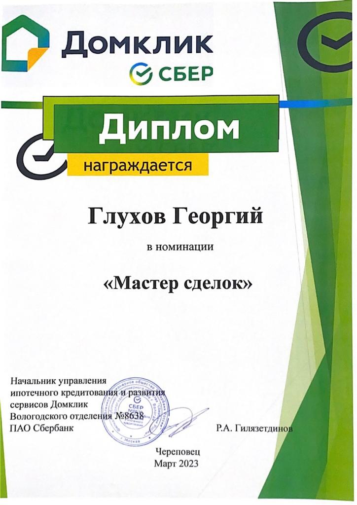 Огромная благодарность риэлтору Глухову Георгию, обращаемся к нему не первый раз. Очень внимательный ко всем мелочам, грамотно проводит сделку, профессионал своего дела!