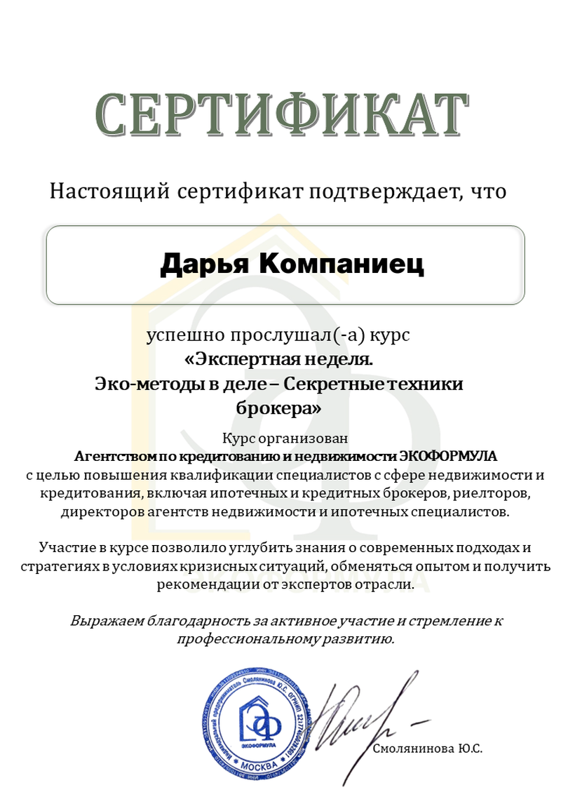 Хочу сказать большое спасибо нашему риелтору Дарье за успешное проведение сделки по покупке дома! Ситуация была очень непростой: альтернативная сделка с детскими долями и участием супругов в разводе. Дарья показала себя настоящим профессионалом. Ее отличное знание законов, особенно по сделкам с участием детей, было очень кстати. Но главное – ее человеческие качества: Дарья умело поддерживала...