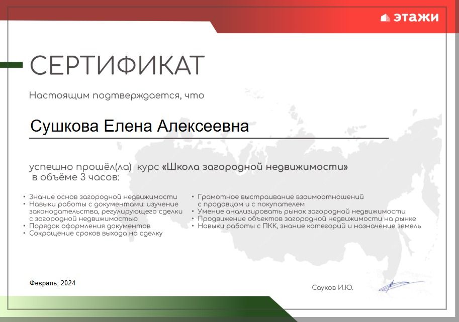 Хочу поделиться своим положительным опытом работы с Сушковой Еленой Алексеевной. С самого начала нашего сотрудничества она проявила высокий уровень профессионализма. Елена всегда была на связи, отвечая на все наши вопросы и предлагая полезные советы. Рекомендую всем кто ищет надёжного и грамотного специалиста.