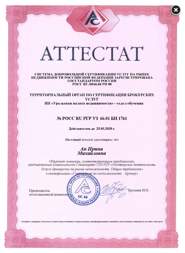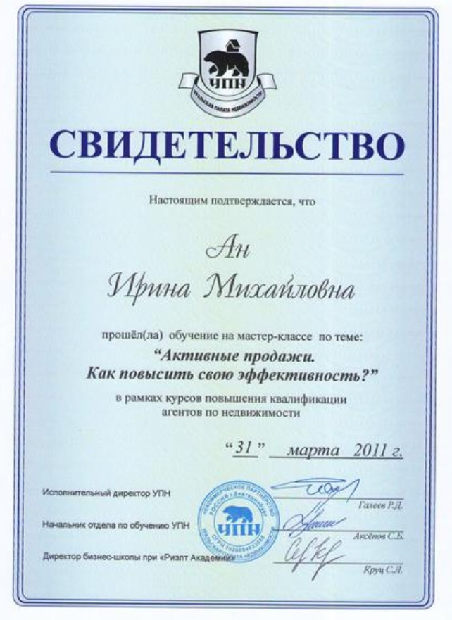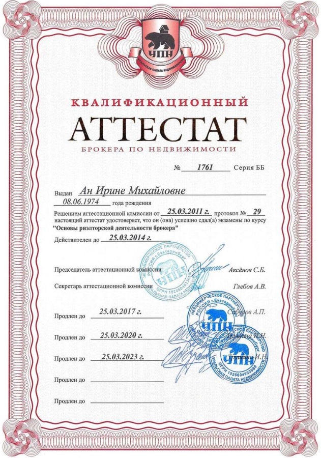Опыт работы риэлтором с 2006 года. В марте 2011 года получила квалификационный аттестат «Брокера». Специализация: все операции на рынке жилой недвижимости, налогообложение в недвижимости