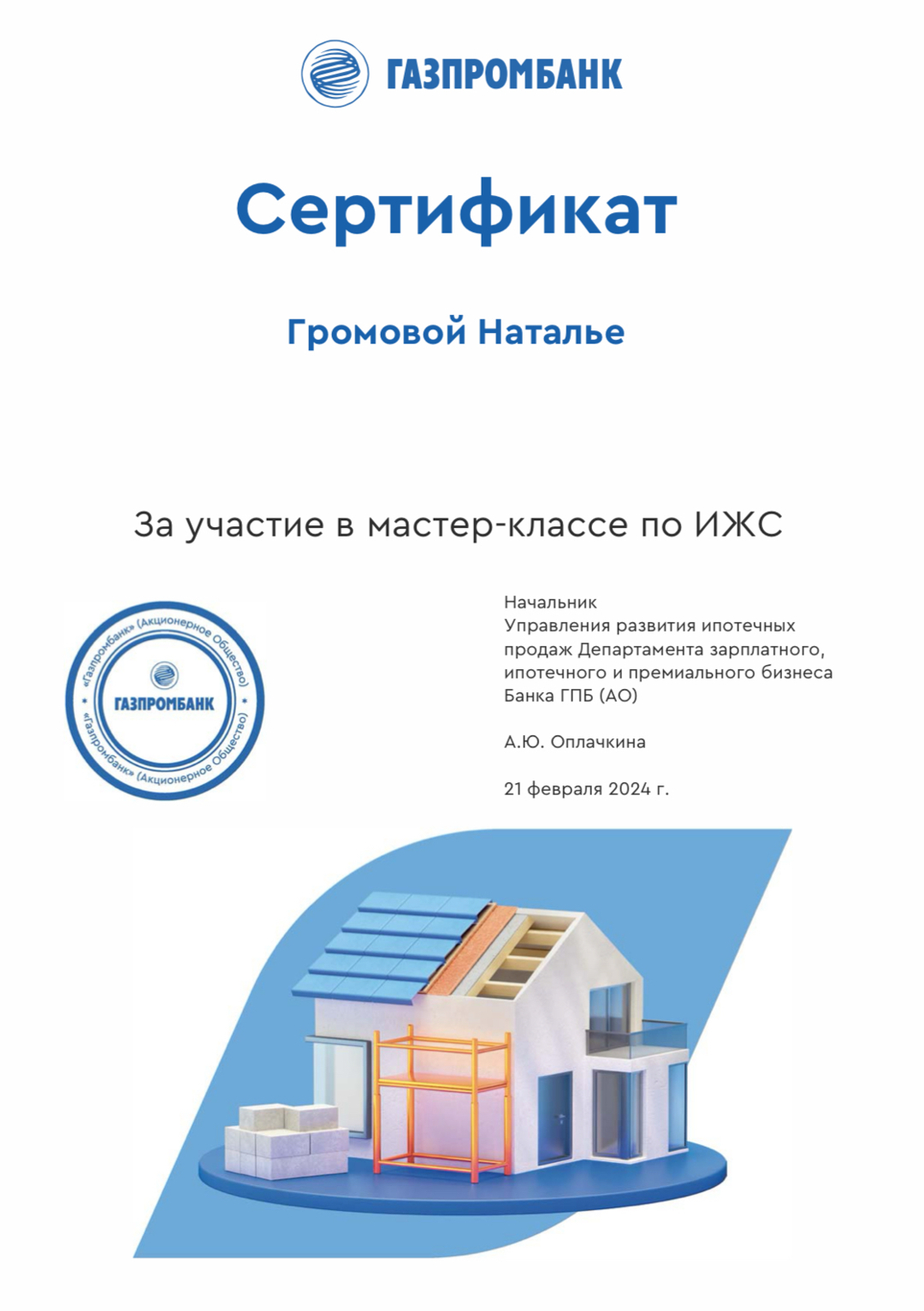Хочу выразить огромную благодарность Громой Наталье за помощь в покупке квартиры. Она справилась с очень сложной задачей: определенный первоначальный взнос, платеж по ипотеке должен быть не более определенной суммы. Параметры желаемой квартиры и ее местоположение не сильно сходились с пунктами выше, но Наталья великолепно справилась с задачей «впихнуть невпихуемое»:) Работать с Натальей одно...