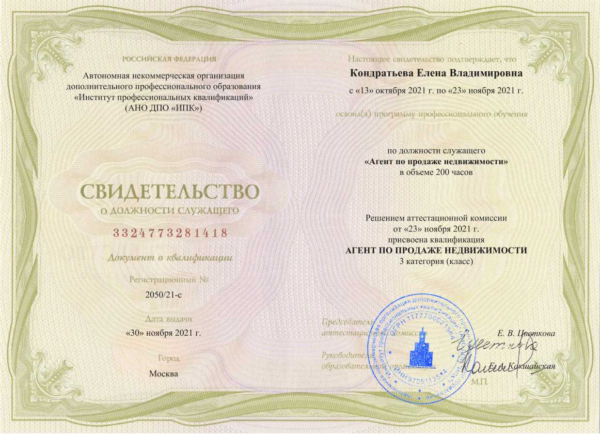 Работаю в области недвижимости с 2001 года.Огромный опыт в сложных сделках,работаю по всем районам города Саратова.Оформление ипотеки,сопровождение сделки,покупка,продажа любой недвижимости в городе Саратове.Прошла обучение в Высшей школе Недвижимости от Агента до Брокера,прошла повышение квалификации с получением диплома государственного образца.