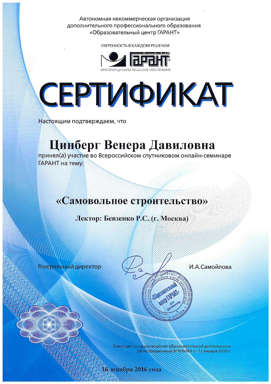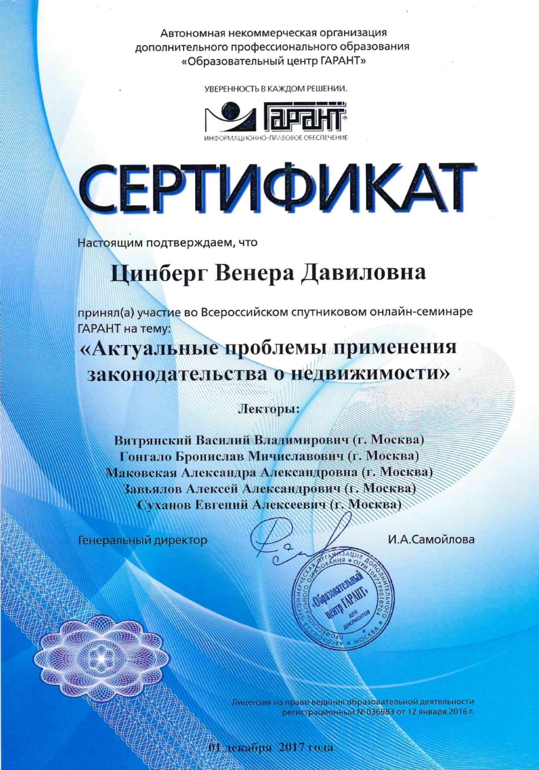 Добрый день! Меня зовут Венера Цинберг,я руководитель риэлторской компании "Практика". Кроме того, продолжаю работать юристом. При обращении ко мне за юридической помощью, Вы можете быть уверены за получение положительного результата.