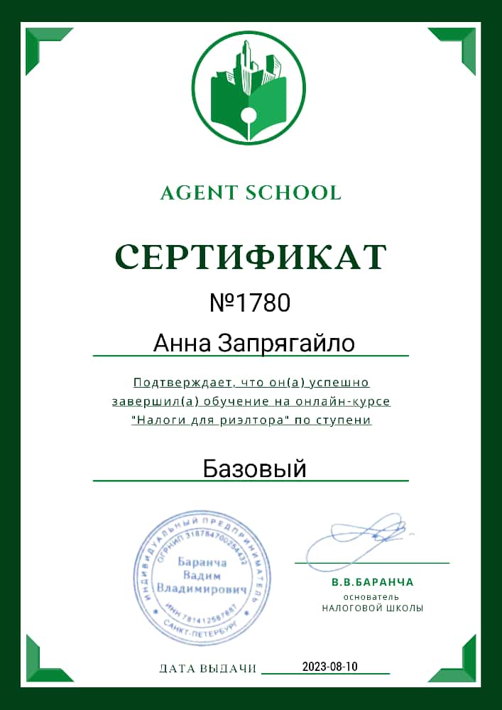 Хочу поблагодарить Запрягайло Анну Игоревну. За помощь в продаже моей квартиры. Все четко,ясно. Сопровождала на каждом этапе до получения денег. Желаю ей успехов и процветания в работе!