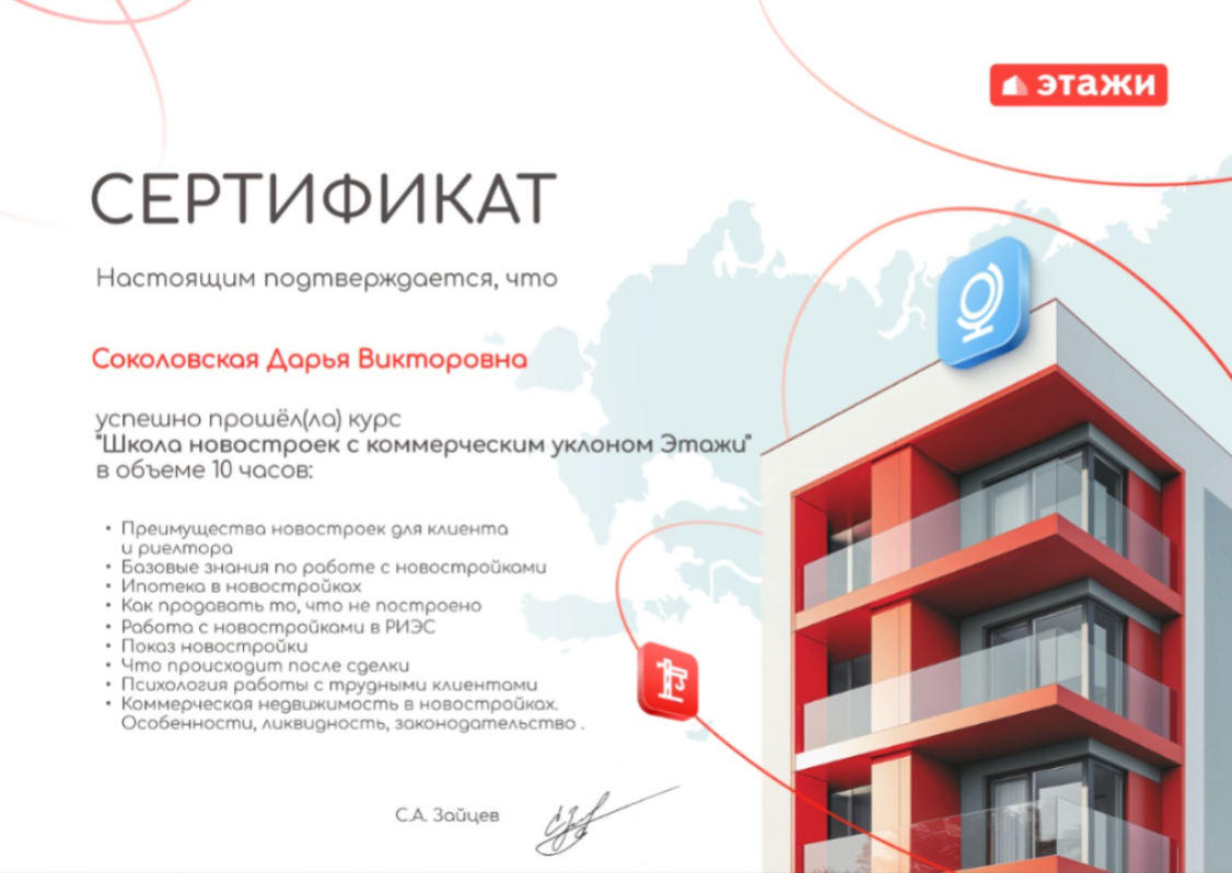 Хочу выразить свою искреннюю благодарность Дарье Соколовской из компании «Этажи» за ее профессионализм и поддержку в процессе покупки моего нового дома. С самого начала работы с Дарьей я почувствовал себя в надежных руках. Она внимательно выслушала все мои пожелания и предложила варианты, которые идеально соответствовали моим требованиям. Дарья всегда была на связи, отвечала на все мои вопросы и...