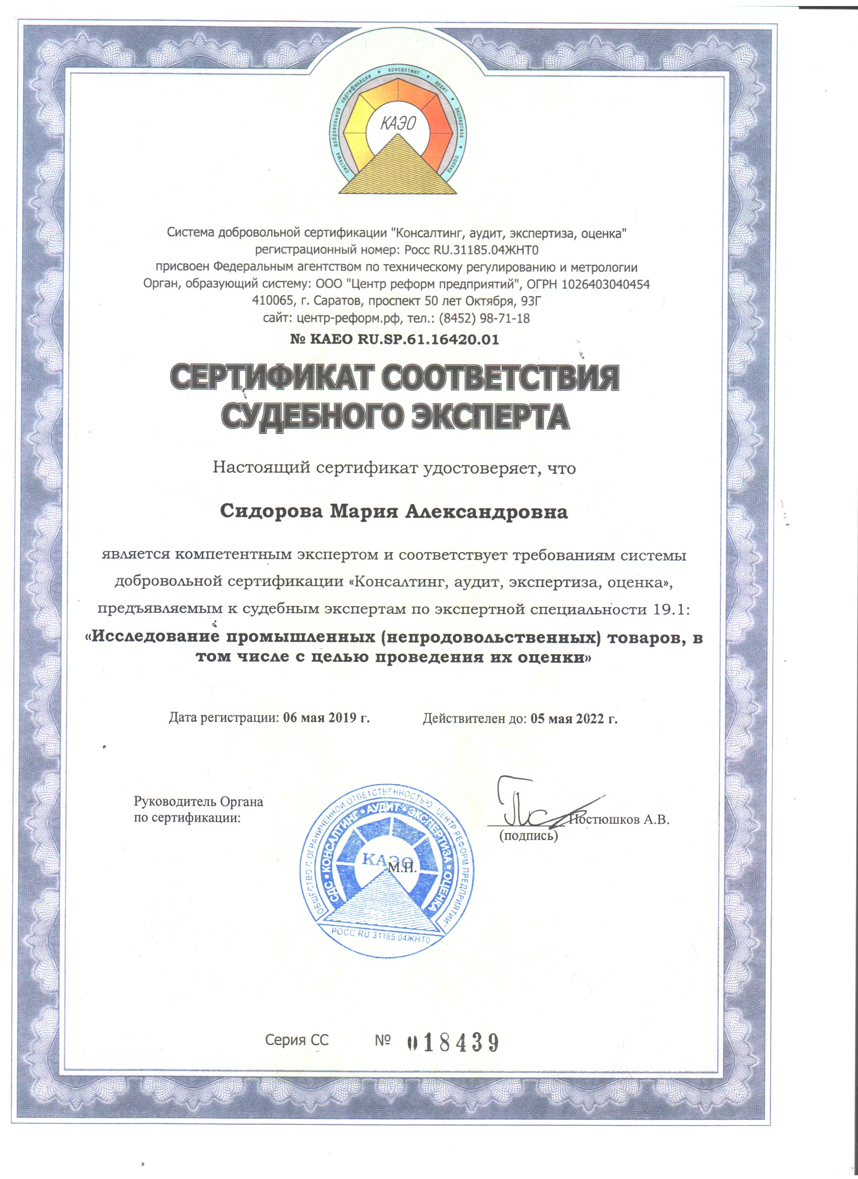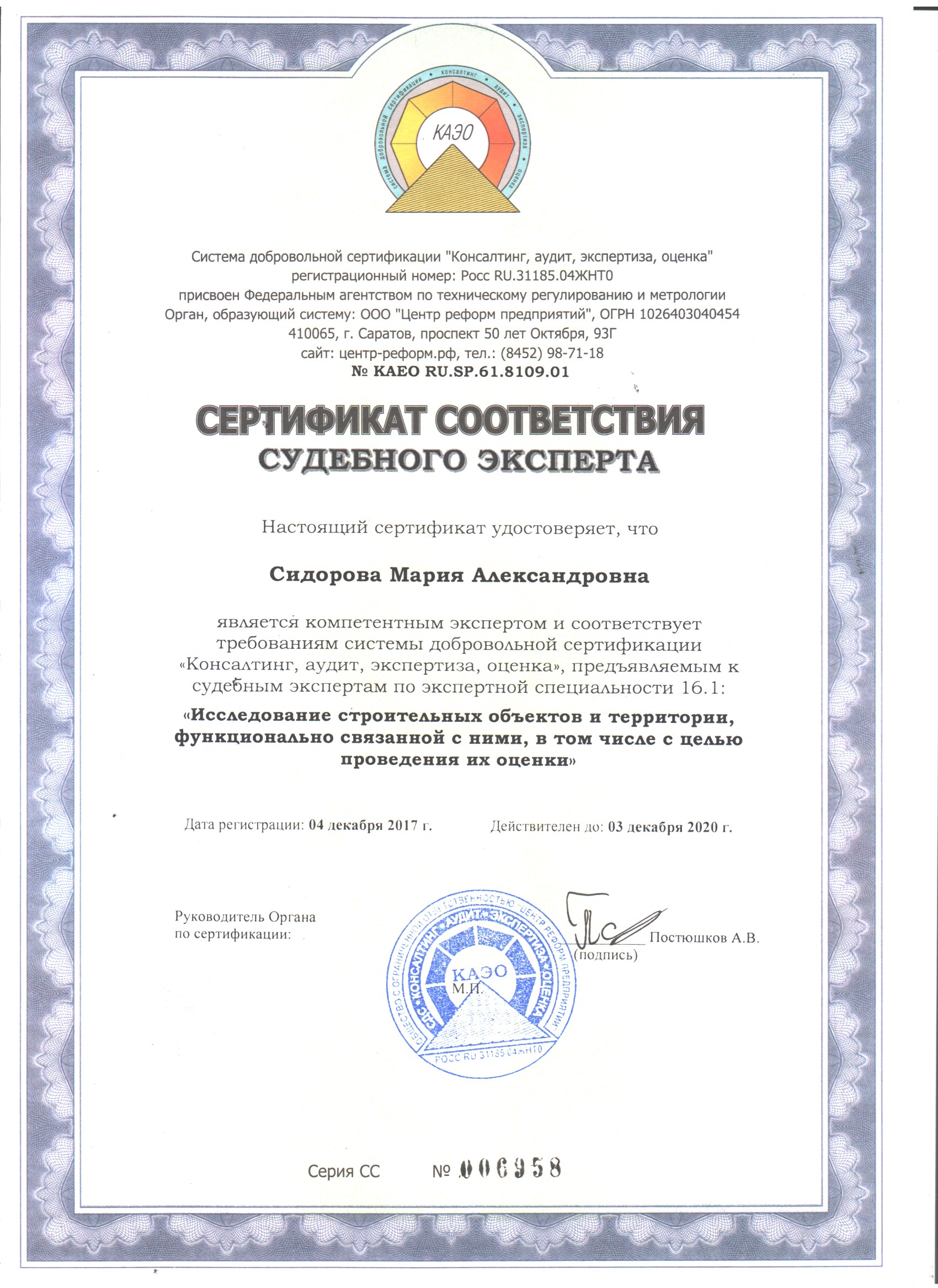 ИП Сидоровой Мария Александровна, судебный эксперт, Диплом высшего юридического образования «Современная гуманитарная академия" ВБА №0369477 от 11.02.2008 г., стаж 11 лет., Диплом о профессиональной переподготовке по программе «Оценка стоимости предприятия (бизнеса)» № 0333, выдан 1.06.2012 года; стаж 7 лет., Диплом № 772402307222 НОУ ВПО Московский финансово-промышленный университет «Синергия»...