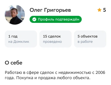 Учитываются объявления, размещённые за последние 12 месяцев. Клиенты могут открыть информацию о риелторе, посмотреть его объявления и найти подходящее.