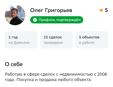 Количество объявлений говорит об активности риелтора. Вы можете открыть информацию о риелторе, посмотреть его объявления и найти подходящее.